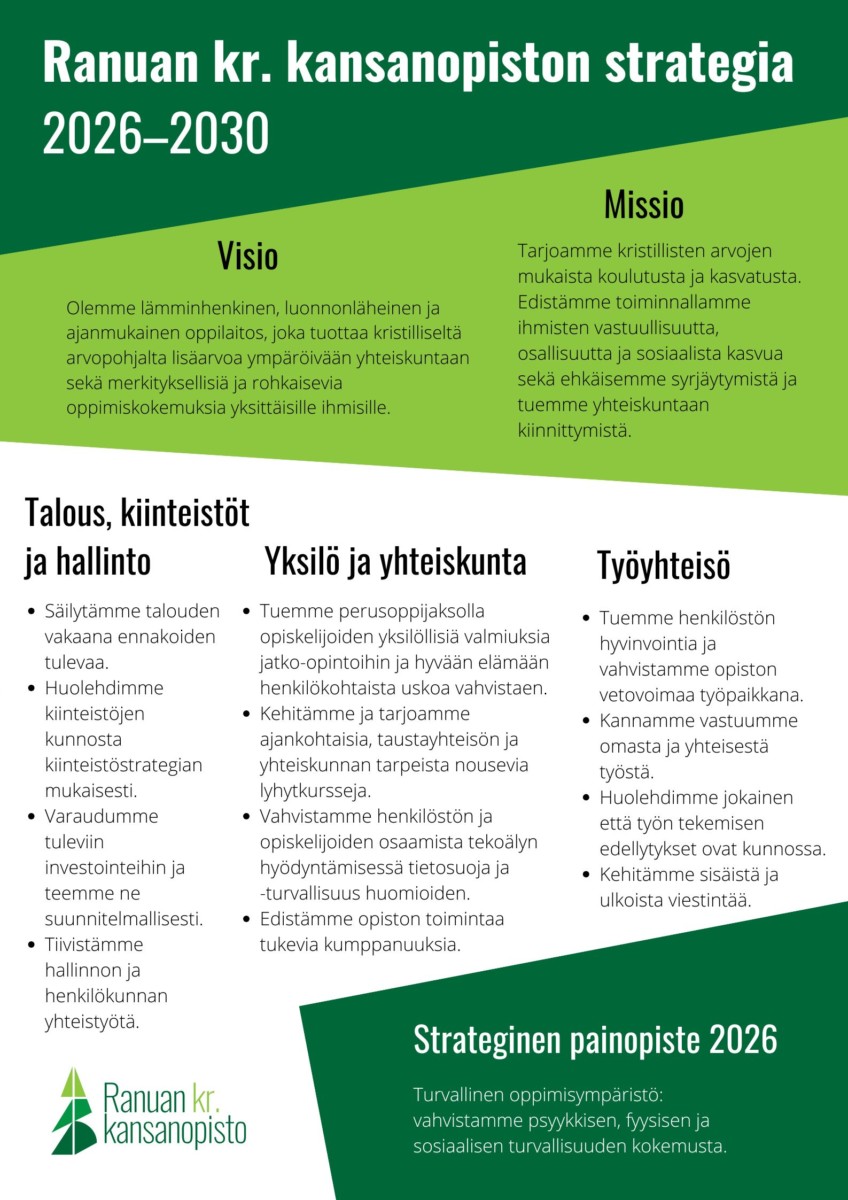 Ranuan kristillinen kansanopisto tarjoaa oppia ja elämyksiä pohjoisesta. Olemme vapaan sivistystyön sisäoppilaitos, jonka Opistovuosi-koulutuksessa opiskelee 147 opiskelijaa yhden lukuvuoden mittaisilla opintopoluilla. Lisäksi tarjoamme laajan ja monipuolisen lyhytkurssivalikoiman.